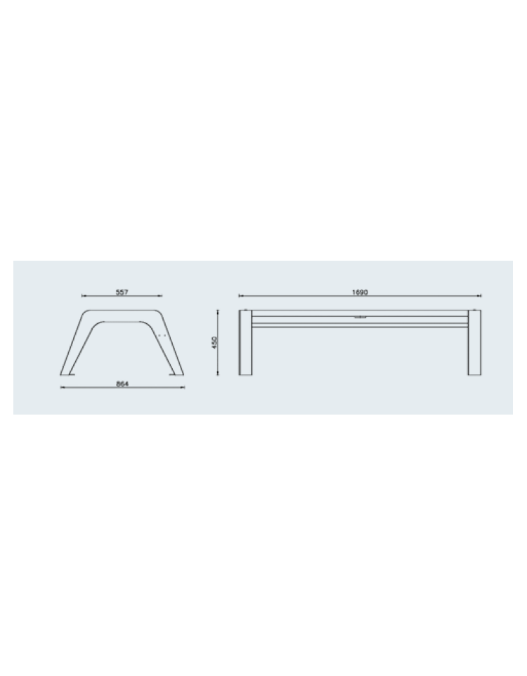 Panchina costituita da due spalle laterali in lamiera di acciaio opportunamente tagliate e sagomate con tecnologia laser. Le due spalle sono tra loro collegate sotto la seduta da due tiranti in tubo tondo per dare maggior rigidità alla panchina. La seduta è composta da doghe in pregio, fissate su tre supporti in piatto, uno centrale e due laterali saldati alle spalle. La piastre base sulle spalle laterali sono predisposte di foro per poter fissare la panchina al suolo tramite tasselli ad espansione. Tutte le parti metalliche sono zincate e verniciate a polveri poliestere termoindurenti. La viteria è in acciaio inox.
