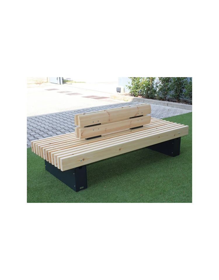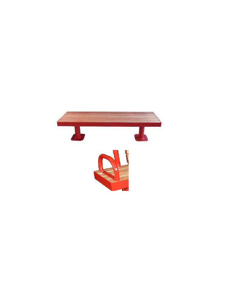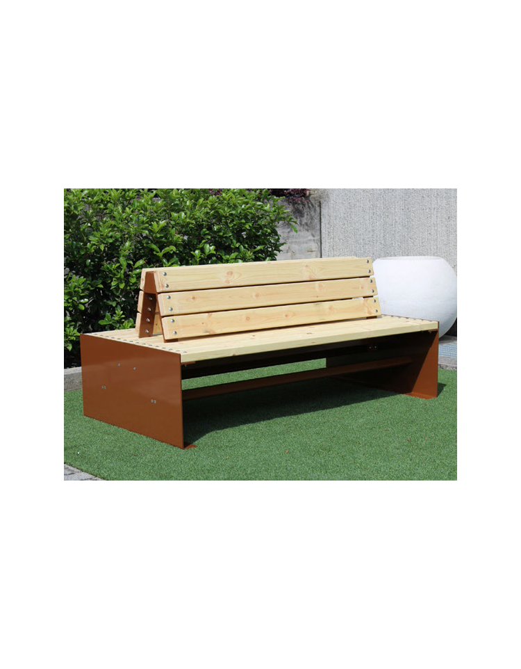 Panchina di acciaio e legno costituita da due robuste spalle laterali in acciaio sp. 8 mm tagliate con tecnologia laser piegate con presso-piega nella parte inferiore a formare le basi di forma semicircolare predisposte per poter fissare la panchina al suolo con tasselli ad espansione. Seduta formata da due tubolari Ø30 in acciaio e 5 doghe di legno di pregio, trattate per l'esterno, fissate su tre supporti in piatto 50x5, uno centrale e due laterali saldati ai supporti laterali sagomati sp.5mm. La seduta è fissata alle spalle tramite viti. Le parti metalliche sono zincate e verniciate a polveri poliestere termoindurenti nelle diverse colorazioni RAL. La viteria in acciaio inox.