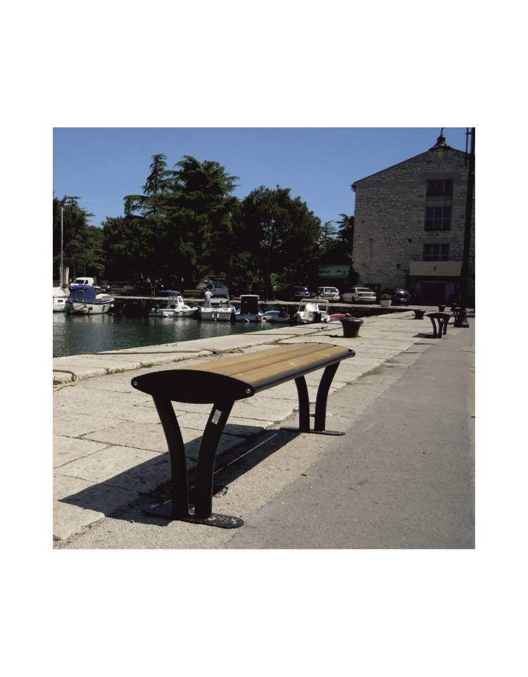 Panchina senza schienale di metallo-legno costituita da due spalle laterali formate da flange in acciaio sagomate con tecnologia laser, alle quali vengono saldati due tubolari in acciaio a sezione ovale, opportunamente sagomati, con funzione di sostegno e una piastra base di forma ovale predisposta per poter fissare la panchina al suolo con tasselli ad espansione. Seduta formata da due tubolari in acciaio e 5 doghe di legno in pino nordico impregnate in autoclave in conformità alle norme DIN 68800-3 per preservare il legno contro l’attacco di funghi, muffe e agenti atmosferici, fissate su tre supporti in piatto, uno centrale e due laterali saldati ai supporti laterali sagomati. La seduta è fissata alle spalle tramite viti. Le parti metalliche sono zincate e verniciate a polveri poliestere termoindurenti nelle diverse colorazioni RAL. La viteria è in acciaio inox.