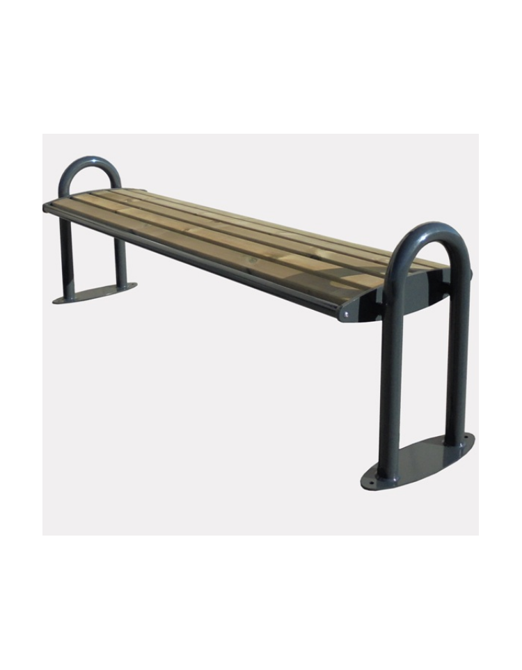 Panchina metallo-legno costituita da due spalle laterali formate da una flangia in acciaio sagomata con tecnologia laser, saldata tramite due spezzoni di tubolare su un arco in tubolare alla estremità inferiore del quale è saldata una base di forma ellittica predisposta per poter fissare la panchina al suolo con tasselli ad espansione. Seduta formata da due tubolari in acciaio e 5 doghe di legno in pino nordico impregnate in autoclave in conformità alle norme DIN 68800-3 per preservare il legno contro l’attacco di funghi, muffe e agenti atmosferici, fissate su tre supporti in piatto, uno centrale e due laterali saldati ai supporti laterali sagomati. La seduta è fissata alle spalle tramite viti. Le parti metalliche sono zincate e verniciate a polveri poliestere termoindurenti nelle diverse colorazioni RAL. La viteria è in acciaio inox. Molto robusta, particolarmente adatta a luoghi di grande affluenza, vie pedonali, grandi parchi.