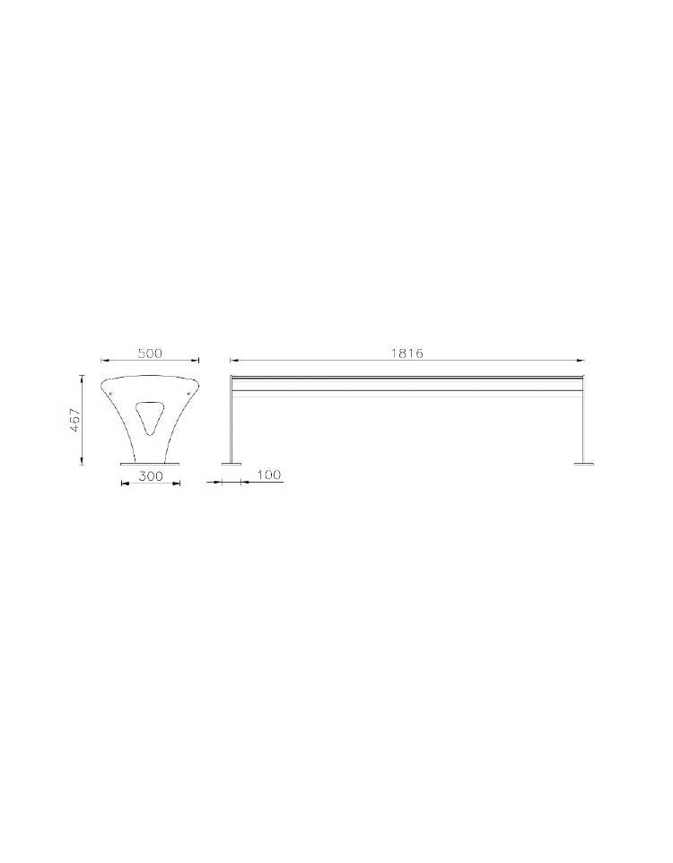 Panchina costituita da due robuste spalle laterali in acciaio tagliate con tecnologia laser saldate su basi di forma ellittica predisposte per poter fissare la panchina al suolo con tasselli ad espansione. Seduta composta da 6 doghe in legno di pregio, trattate per l'esterno, fissate su tre supporti in piatto, uno centrale e due laterali saldati ai supporti laterali. Le spalle laterali sono inoltre collegate tra loro tramite due tiranti in tubolare posti sotto la seduta per dare maggior rigidità alla panchina. Le parti metalliche sono zincate e verniciate a polveri poliestere termoindurenti nelle diverse colorazioni RAL. La viteria è in acciaio inox.