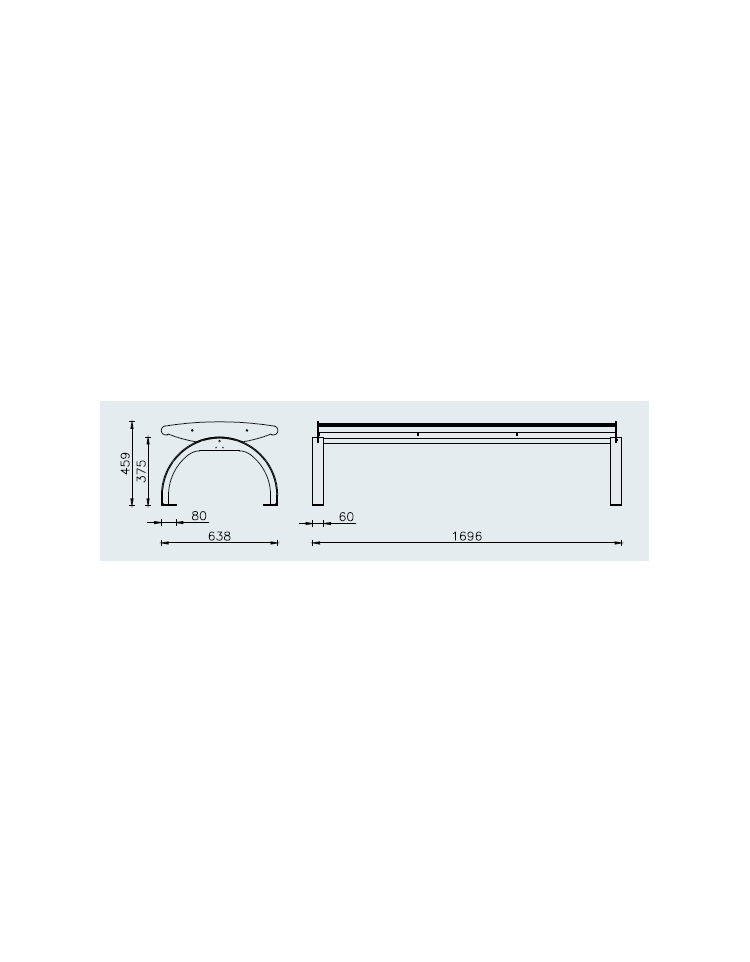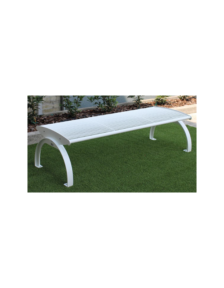 Panchina metallica costituita da due spalle laterali formate da una flangia sagomata con tecnologia laser, saldata su un arco in profilo a “T” con piastrine saldate alle base per poter fissare la panchina al suolo con tasselli ad espansione. Seduta formata da 16 tondini di acciaio e 2 tubolari, saldati a due supporti laterali e 2 supporti centrali sagomati. La seduta è fissata alle spalle tramite viti. Le parti metalliche sono in acciaio inox. La viteria in acciaio inox. Molto robusta, particolarmente adatta a luoghi di grande affluenza, vie pedonali, grandi parchi, adatta anche nella versione inox per luoghi sotterranei (fermate metropolitane, stazioni treno).