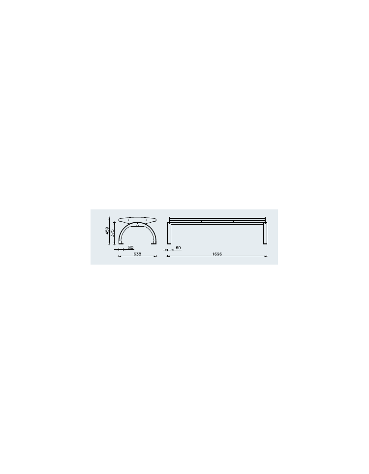 Panchina metallica costituita da due spalle laterali formate da una flangia sagomata con tecnologia laser, saldata su un arco in profilo a “T” con piastrine saldate alle base per poter fissare la panchina al suolo con tasselli ad espansione. Seduta formata da due tubolari in acciaio e 4 doghe di legno di pregio trattate per l'esterno, fissate su tre supporti in piatto, uno centrale e due laterali saldati ai supporti laterali sagomati. Le parti etalliche sono zincate e verniciate a polveri poliestere termoindurenti nelle diverse colorazioni RAL. La viteria in acciaio inox. Molto robusta, particolarmente adatta a luoghi di grande affluenza, vie pedonali, grandi parchi, fermate metropolitane, stazioni treno, centri commerciali.
