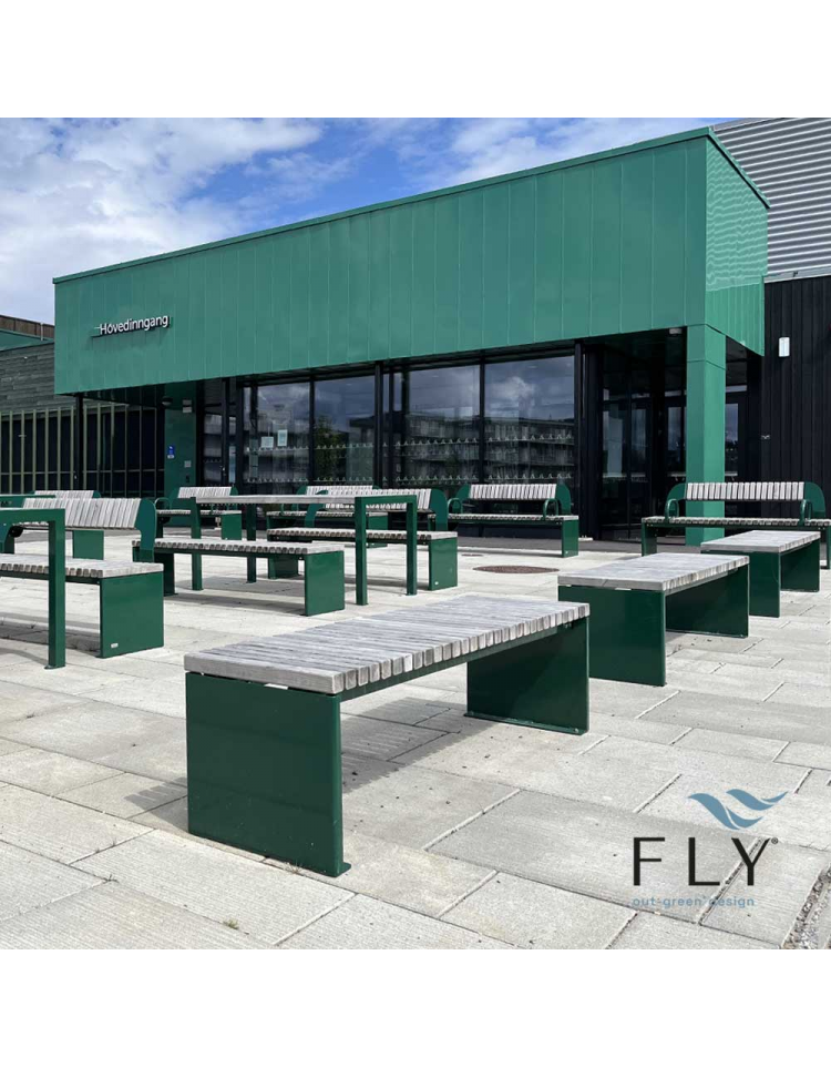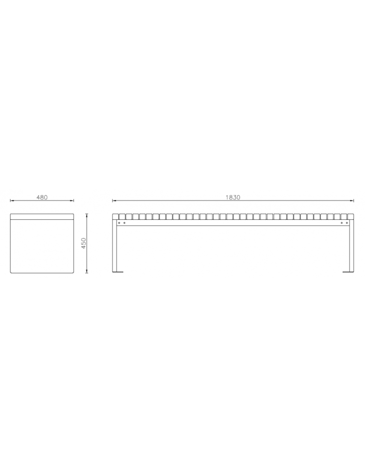 Panchina L. 1800 mm con struttura in acciaio zincato e verniciato, costituita da due supporti in lamiera con piastre base per il fissaggio con tasselli. La seduta è formata da doghe in legno di pregio trattato per esterno.