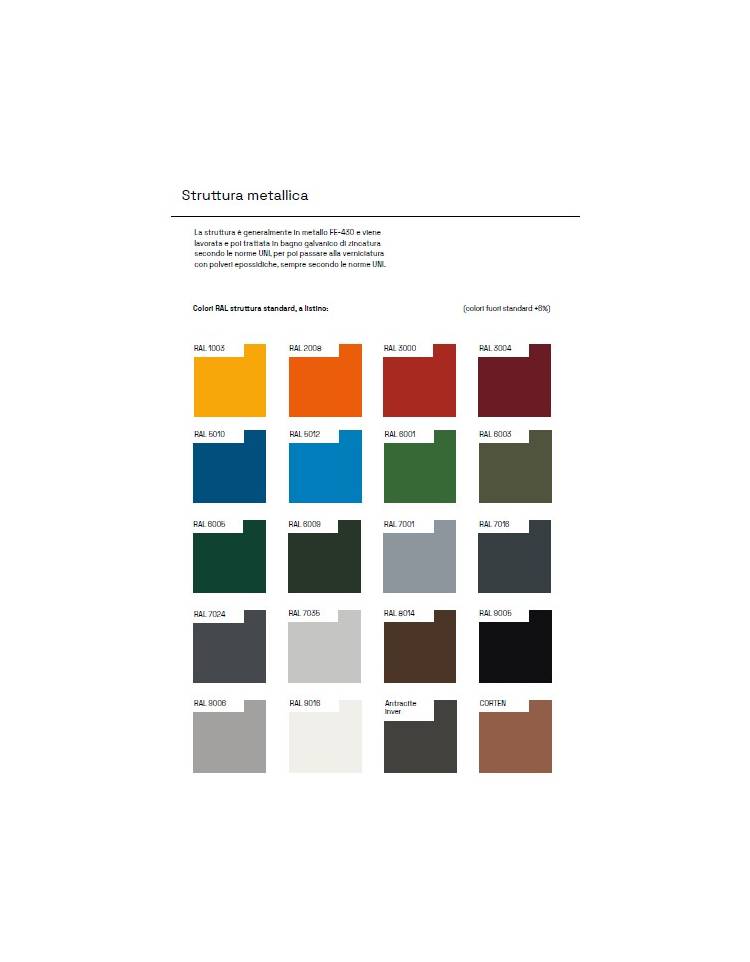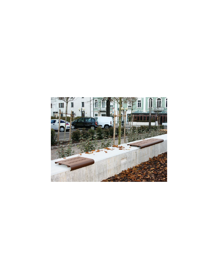Panchina interamente realizzata in acciaio zincato e verniciato. Realizzata in lamiera opportunamente calandra e con tagli al laser. Con fori per il fissaggio al muro.