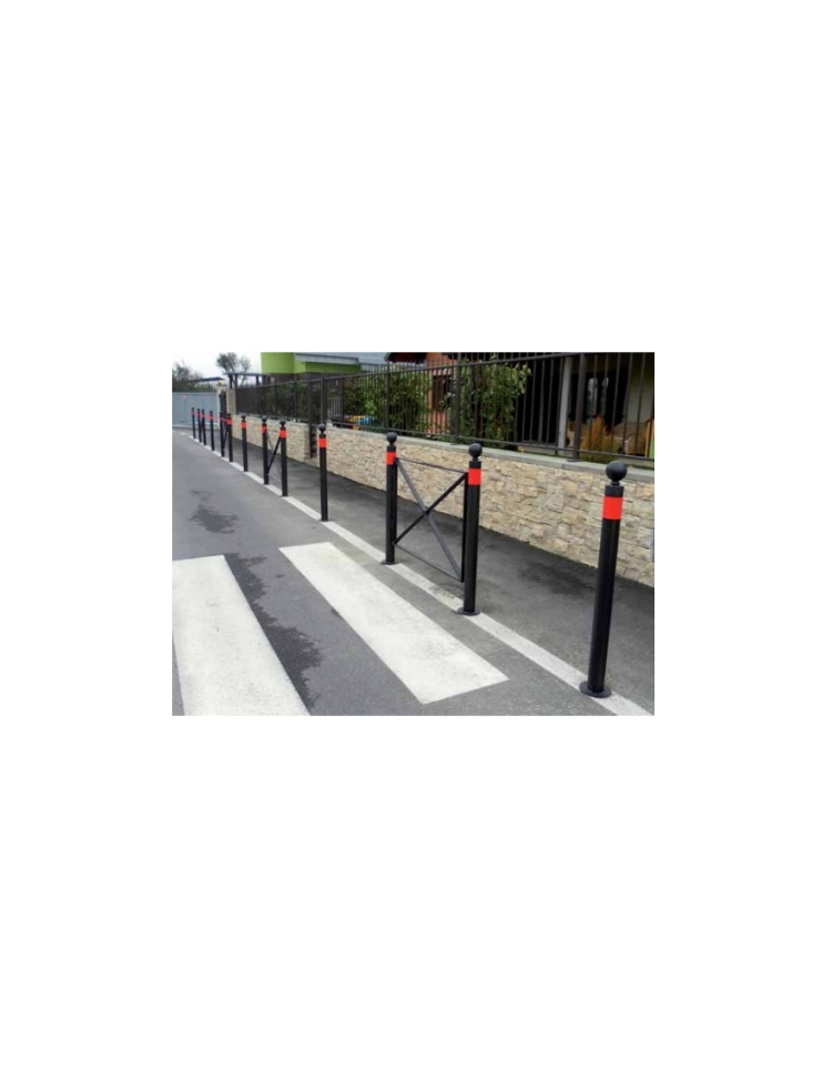 La barriera è composta da due sostegni in tubolare di acciaio Ø80x2 con sovrastante borchia Ø40 e sfera Ø90mm in acciaio forgiato e con flangia alla base Ø150mm