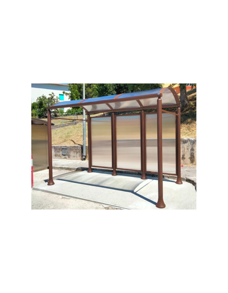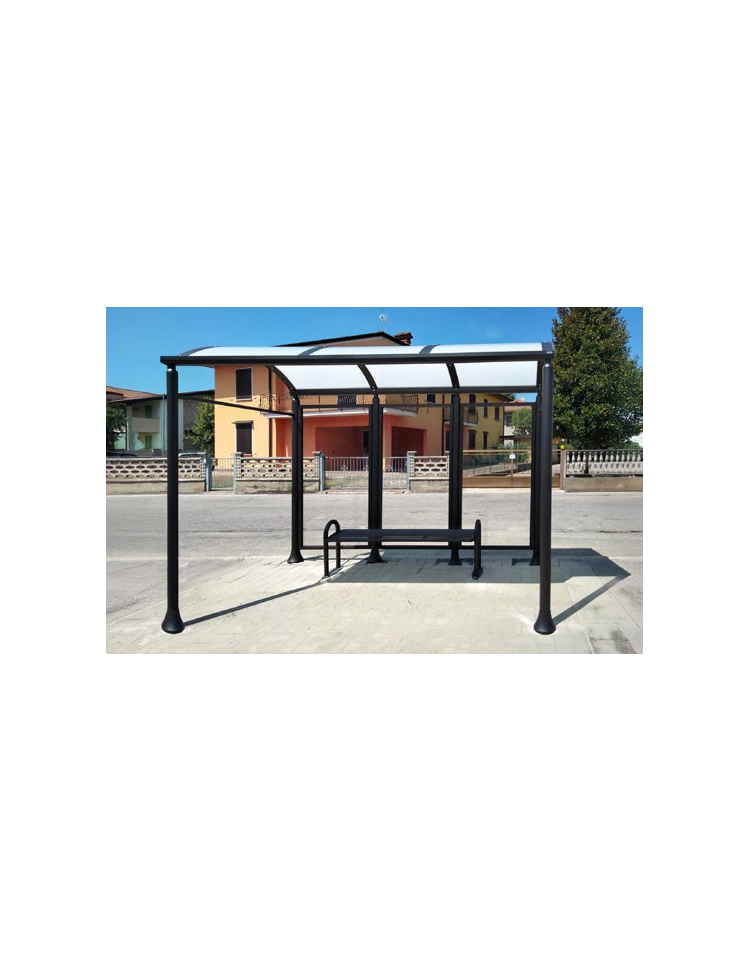 La pensilina è costituita da colonne portanti in acciaio D.90 mm con innesto di rinforzo in tubo d’acciaio D.50x2 mm e base in acciaio zincato sp. 15/10 mm, collegate superiormente da un profili in lamiera piegata con funzione di pluviale, tutto verniciato a polveri P.P.