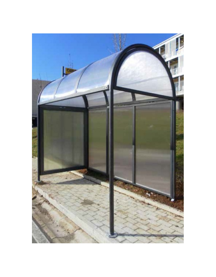 Pensilina per attesa autobus realizzata da 2 archi a tutto sesto in tubolare d’acciaio dal diametro di 60x2 mm collegati a 2 grondaie in lamiera d’acciaio con spessore di 25/10 pressopiegata di dimensioni 60x60 mm che fungono anche da traversi orizzontali di sostegno della copertura. E’ dotata di 4 piastre base diametro 150 mm saldate alle estremità inferiori dei due archi per poter essere fissata al suolo con tasselli ad espansione.