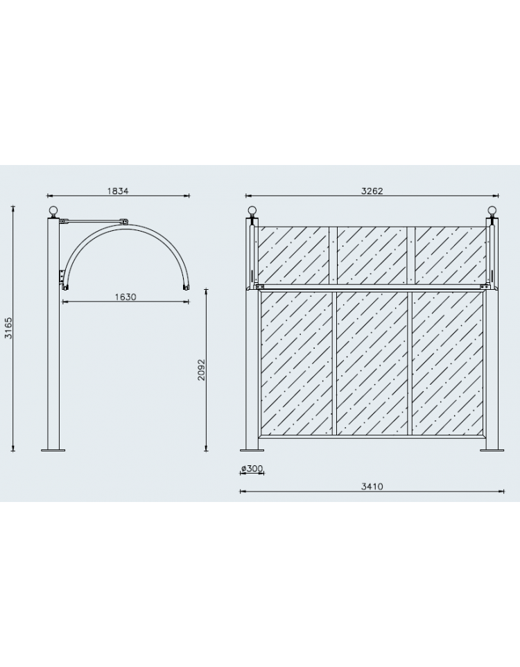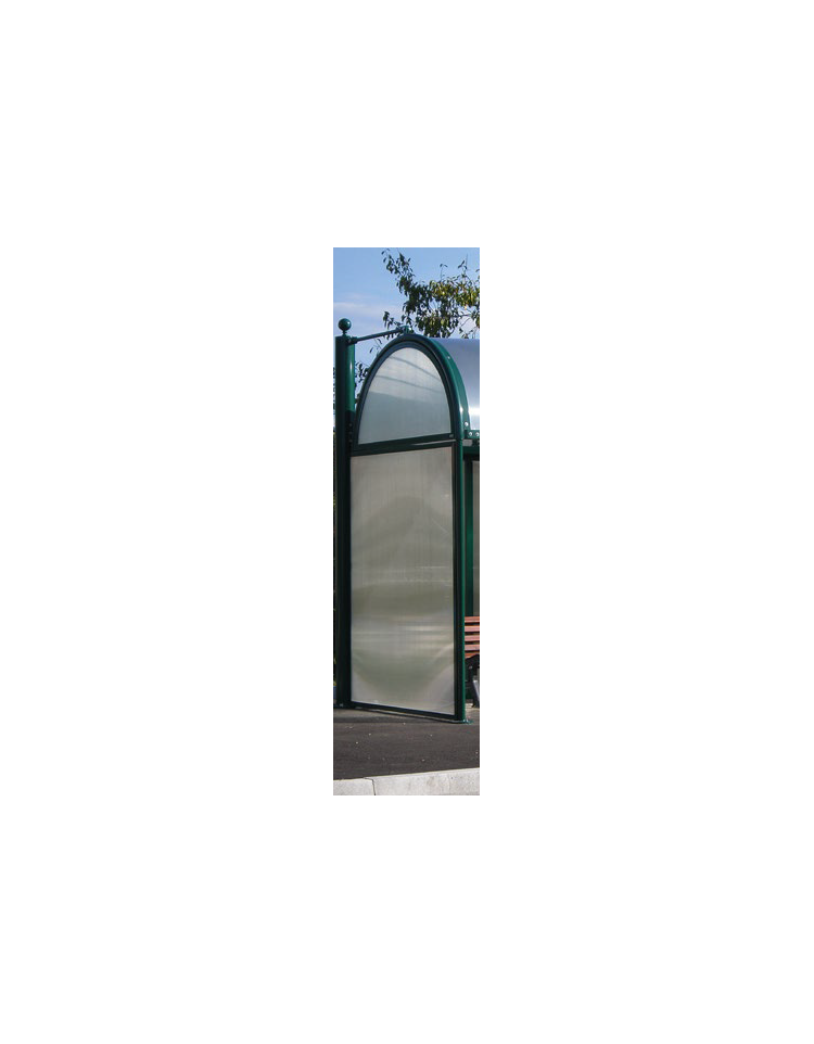 La parete di fondo (e le pareti laterali a richiesta) sono costituite da un telaio in estruso di alluminio con pannelli di policarbonato alveolare sp.10 mm fissati a mezzo di fermavetri a scatto. Tutte le parti metalliche della struttura sono zincate e verniciate a polveri poliestere termoindurenti nelle diverse colorazioni RAL a richiesta.
