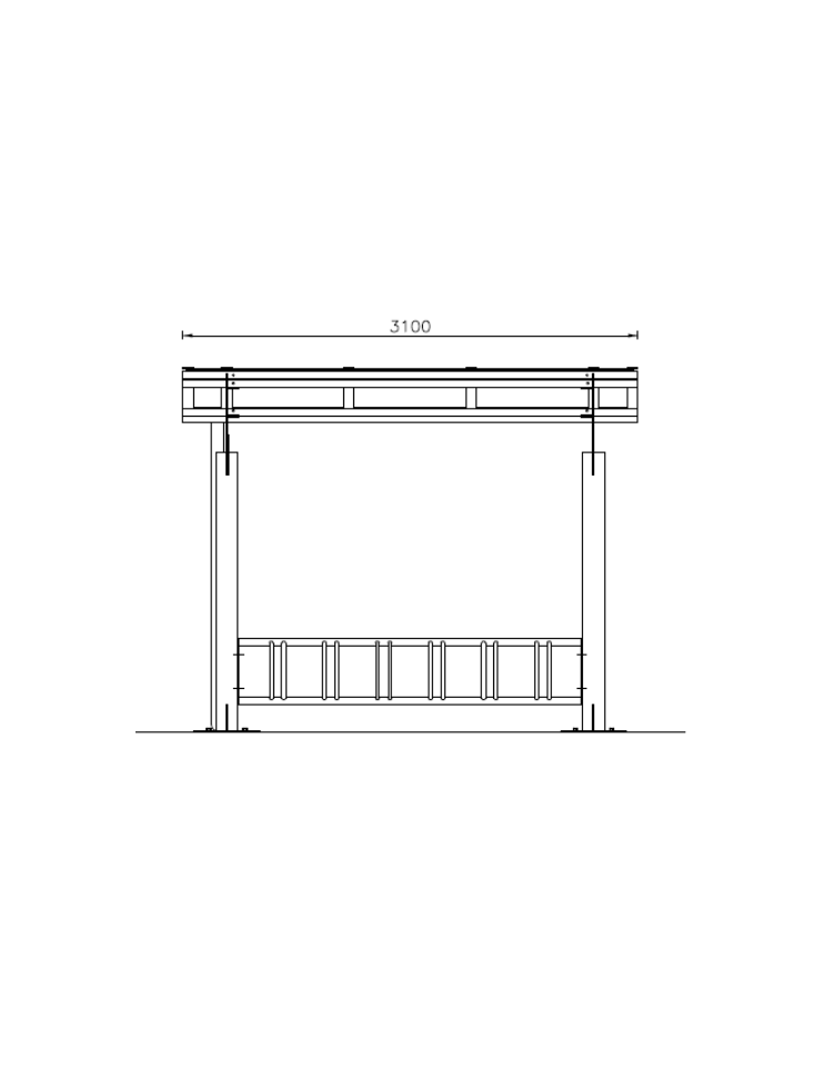 Copertura bifacciale modulo base composta da due supporti laterali in tubolare di acciaio e da fianchi in lamiera opportunamente sagomati con taglio laser. La copertura può essere in policarbonato alveolare o in policarbonato compatto, sostenuta da traversi in tubolare. Centralmente la copertura viene fornita di grondaia in lamiera pressopiegata. Il fissaggio al suolo è con piastra base prevista di fori per fissaggio con tasselli. La rastrelliera viene fissata lateralmente direttamente sulle colonne portanti. Tutte le parti metalliche sono zincate e verniciate.