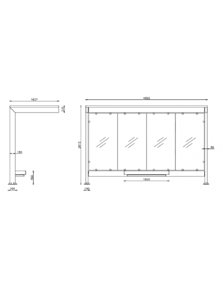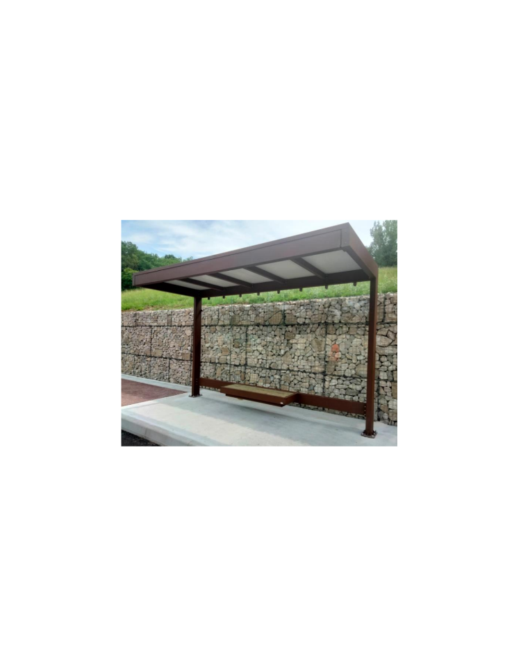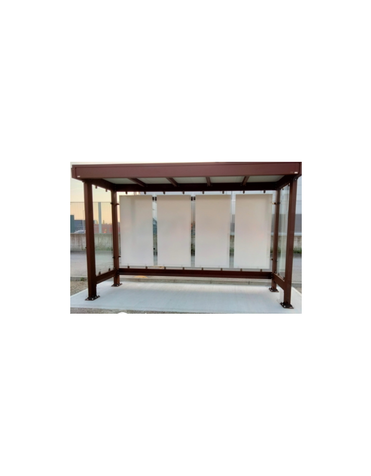 La pensilina per attesa bus è una pensilina a sbalzo ed è sostenuta da due colonne portanti per il sostegno di fianchi in lamiera d’acciaio opportunamente sagomati. Le colonne alla base sono provviste di flangia forata per il fissaggio al suolo della pensilina mediante tasselli ad espansione (non forniti). La copertura con pannelli coibentati è sostenuta da tubolari fissati al telaio perimetrale della copertura. La parete di fondo è costituita da lastre di vetro stratificato fissate alle colonne con adeguate pinze porta vetro. Su richiesta possono essere fornite anche le pellicole opache come mostrato nelle immagini. Può essere dotata di parete laterale, bacheca laterale porta pubblicità illuminata con anta apribile e panchina integrata alla struttura. Tutte le parti metalliche sono zincate secondo normative UNI e verniciate a polveri poliestere termoindurenti. La viteria è in acciaio inox. La copertura può essere in policarbonato o lamiera coibentata.