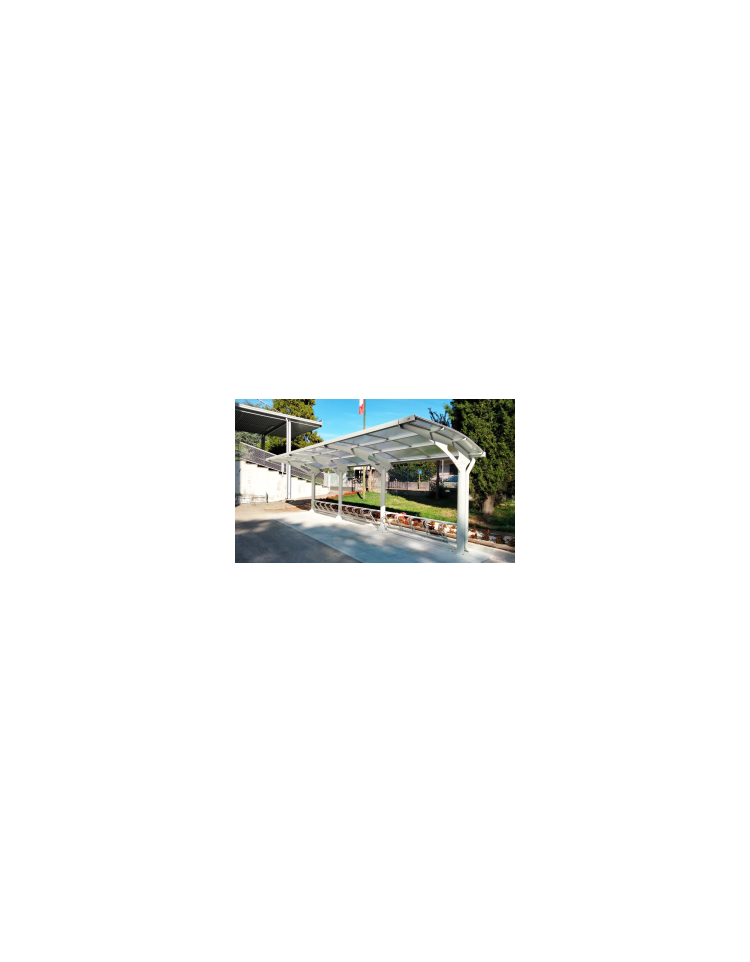 Copertura monofacciale componibile a moduli composta da due supporti laterali in tubolare di acciaio e da fianchi in lamiera opportunamente sagomati con taglio laser. La copertura può essere in policarbonato alveolare o in policarbonato compatto, sostenuta da traversi in tubolare. Posteriormente la copertura viene fornita di grondaia in lamiera pressopiegata. Il fissaggio al suolo è con piastra base prevista di fori per fissaggio con tasselli. La rastrelliera (su richiesta) viene fissata lateralmente direttamente sulle colonne portanti. Tutte le parti metalliche sono zincate e verniciate.