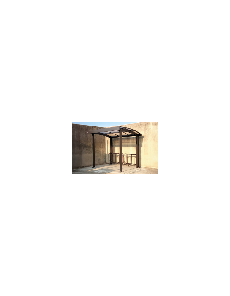 Copertura modulo base composta da colonne in tubo rettangolare unite tramite laser in lamiera. La copertura è in policarbonato alveolare, sostenuta da traversi in tubolare e profili in alluminio con guarnizioni di tenuta. Posteriormente la copertura viene fornita di grondaia in lamiera. Il fissaggio al suolo è effettuato tramite piastra base provvista di fori per l’ancoraggio con tasselli. La rastrelliera (su richiesta) può essere fissata lateralmente direttamente sulle colonne portanti della copertura. Su richiesta può essere fornita con parete di fondo in policarbonato o da lamiera forata. Tutte le parti metalliche sono zincate e verniciate.