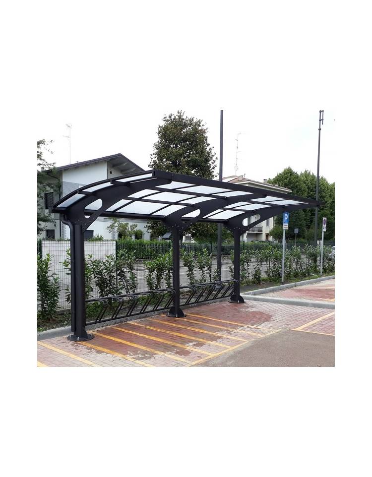 Copertura monofacciale composta da due supporti laterali in tubolare di acciaio e da fianchi in lamiera opportunamente sagomati con taglio laser. La copertura può essere in policarbonato alveolare o in policarbonato compatto, sostenuta da traversi in tubolare. Posteriormente la copertura viene fornita di grondaia in lamiera pressopiegata. Il fissaggio al suolo è con piastra base prevista di fori per fissaggio con tasselli. La rastrelliera (su richiesta) viene fissata lateralmente direttamente sulle colonne portanti. Tutte le parti metalliche sono zincate e verniciate.
