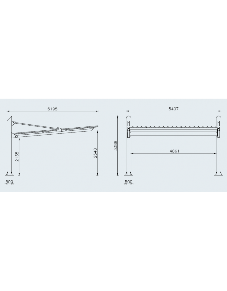 La struttura è composta da colonne portanti in tubolare di acciaio. Il puntone, anch’esso in tubolare di acciaio, è incernierato alla colonna e sostenuto da un tirante, sempre in tubolare di acciaio. La copertura è sorretta da quattro profili omega, che servono anche da collegamento tra le colonne portanti, e può essere realizzata in lamiera grecata pre-verniciata oppure in lamiera coibentata. Tutte le parti metalliche sono zincate a caldo e, a preventivo, possono essere verniciate nelle diverse colorazioni RAL. La viteria è in acciaio inox.
