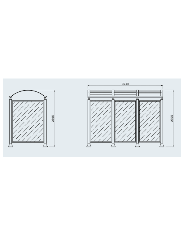 Pensilina per fumatori realizzata con colonne portanti in acciaio complete di basi di ancoraggio, collegate superiormente da un profilo in lamiera piegata con funzione di raccolta e deflusso delle acque piovane. La pensilina è fornita completa di 3 pareti e mezzo (frontale) laterali in policarbonato. La parete frontale è completamente aperta. Tutte le parti metalliche sono zincate secondo normative UNI e verniciate a polveri poliestere termoindurenti. La viteria è in acciaio inox.