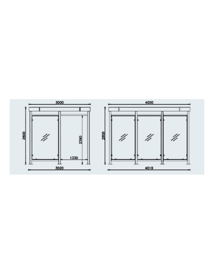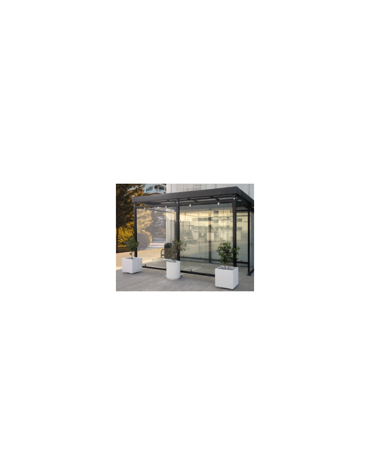 Pensilina per fumatori con struttura in acciaio zincato e verniciato, con pareti in vetro e tetto in policarbonato o lamiera grecata. Su richiesta c'è la possibilità di inserire panchina e cestino spegnisigarette e illuminazione. La struttura è chiusa su 3 lati