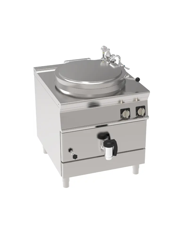 Piano di lavoro e pannelli frontali e laterali in acciaio INOX 304. Interno in acciaio inox. Recipiente di cottura in acciaio inox AISI 304 con spessore 15/10, fondo in acciaio inox AISI 316 con spessore 20/10. Intercapedine con fondo e pareti in acciaio inox AISI 304, fondo spessore 20/10, pareti spessore 15/10. Riscaldamento di tipo indiretto con vapore a bassa pressione (0,5 bar), generato all’interno dell’intercapedine tramite resistenze corazzate in incoloy dotate di termostato di sicurezza. Rubinetti di rabbocco acqua calda e fredda posti sul piano di lavoro con becco erogatore snodabile per il riempimento e il lavaggio del recipiente e dell’intercapedine. Rubinetto di scarico da 2 pollici in ottone cromato con maniglia atermica. Quattro blocchetti di fissaggio a vite, regolabili manualmente, con valvola a taratura fissa di 0,05 bar. Manometro meccanico con indicatore di pressione dell’intercapedine. Erogazione di potenza regolata da un commutatore a 3 posizioni. Comando separato per la regolazione della temperatura. Spia di linea e spia di raggiungimento temperatura