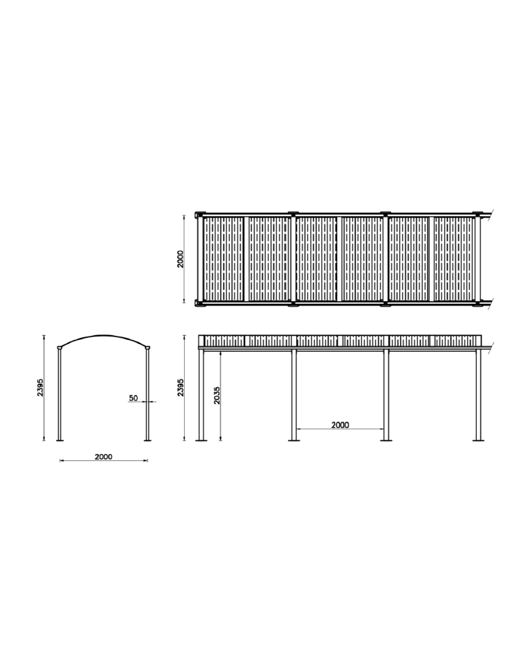 La copertura è formata da pannelli in policarbonato alveolare sostenuti da una struttura di centine e contro centine in lamiera.