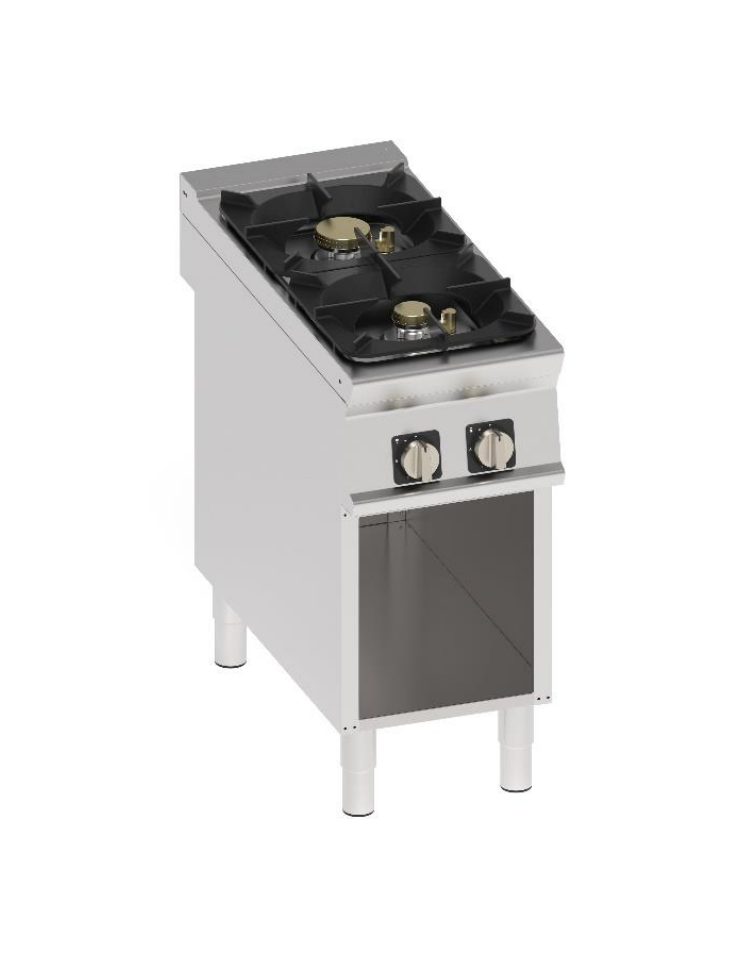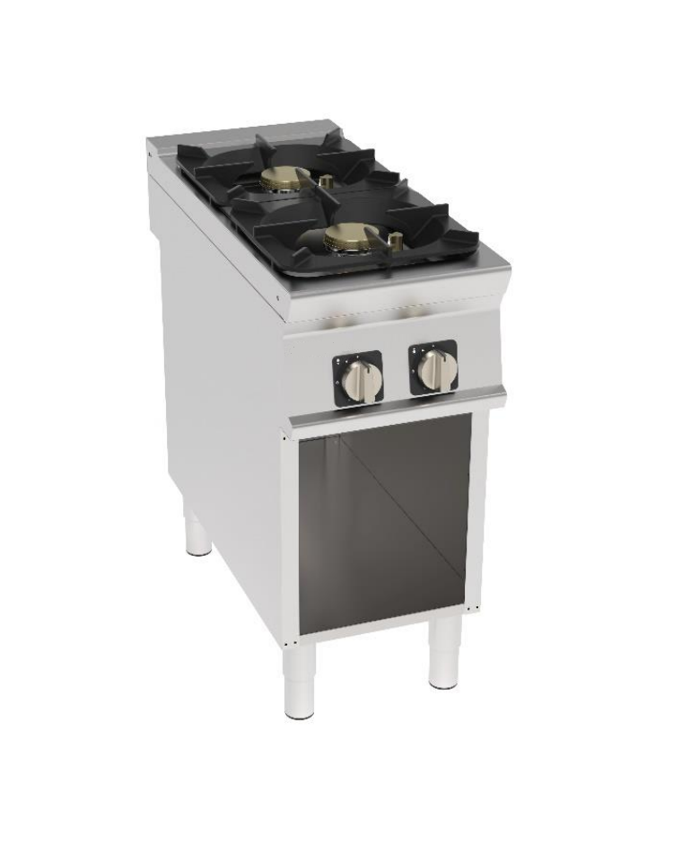 Piano cottura ad acqua su mobile a giorno*, per uso professionale. Fuochi con accensione a mezzo fiamma pilota, rubinetti con valvola di sicurezza e termocoppia. Bruciatori a fiamma modulante, griglie in tondino acciaio inox. Sistema con vasca ad acqua, con possibilità di flusso continuo e con deflusso a mezzo troppopieno. Dotati di rubinetto carico acqua e sfioratore.