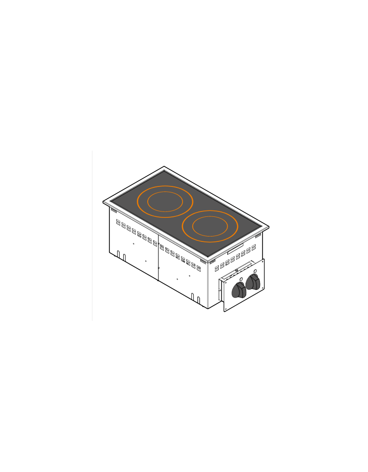 Drop-in elettrico ad induzione, dimensioni da 35 x 65 x 29,5 cm, con 2 zone di cottura indipendenti da 3,5 kW ciascuna.