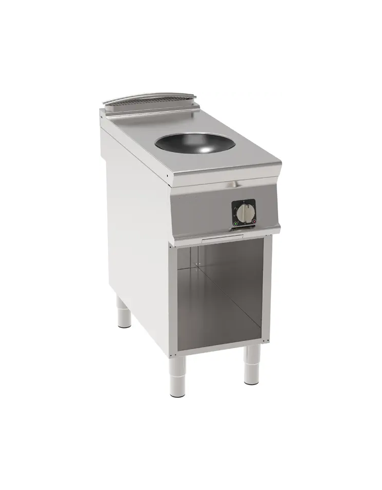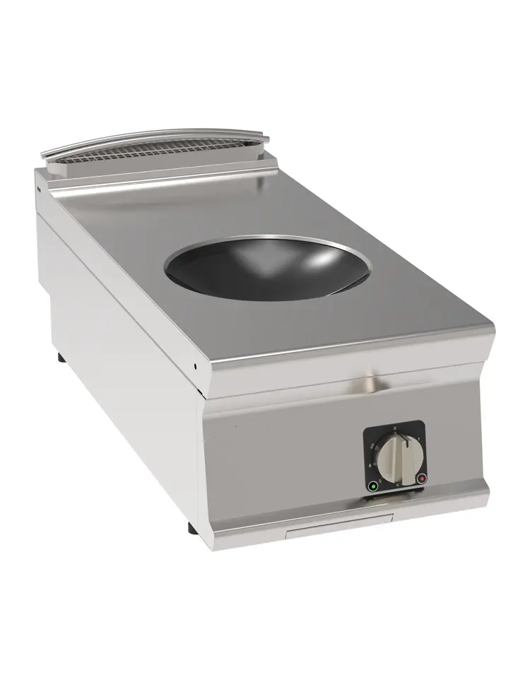 Piani di cottura a induzione di tipo "WOK” per uso professionale. Piano in vetroceramica ad induzione, con zone di elevata potenza. Anche con comandi digitali. Riscalda il contenuto solo quando la pentola, dotata di fondo d'acciaio magnetico, vi è posta a contatto. Garanzia di cottura delicate e rapide. e. Piano con il WOK adatto per l'uso della tipica padella a forma concava che permette di friggere, soffriggere e stufare in tempi e condimenti ridotti.