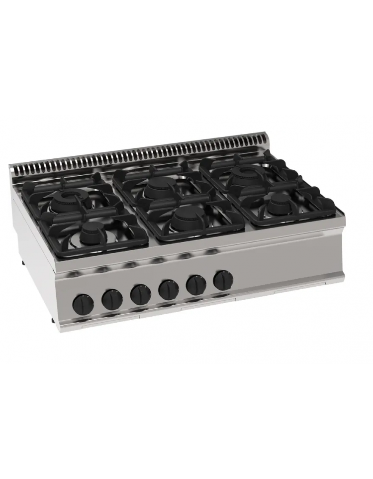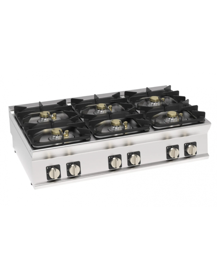 Piano di cottura in acciaio inox CrNi 18/10 AISI 304 a gas 6 fuochi - potenza gas: 35 kW - 30.100 kcal/h - cm 120x70,5x28h