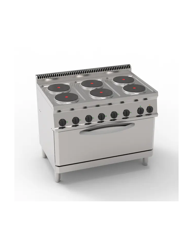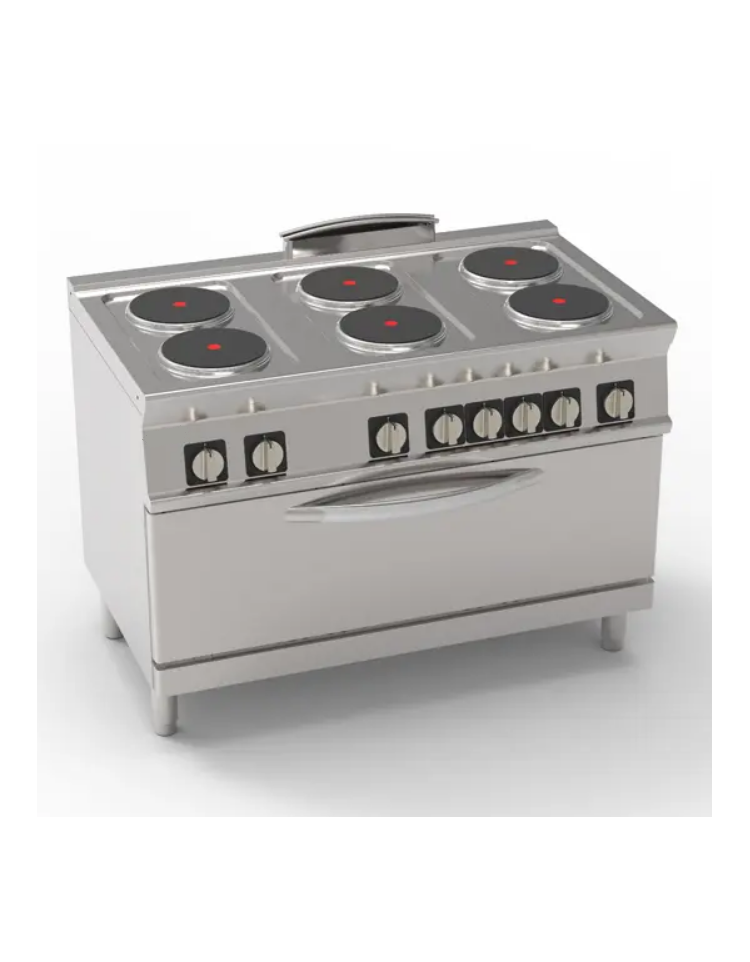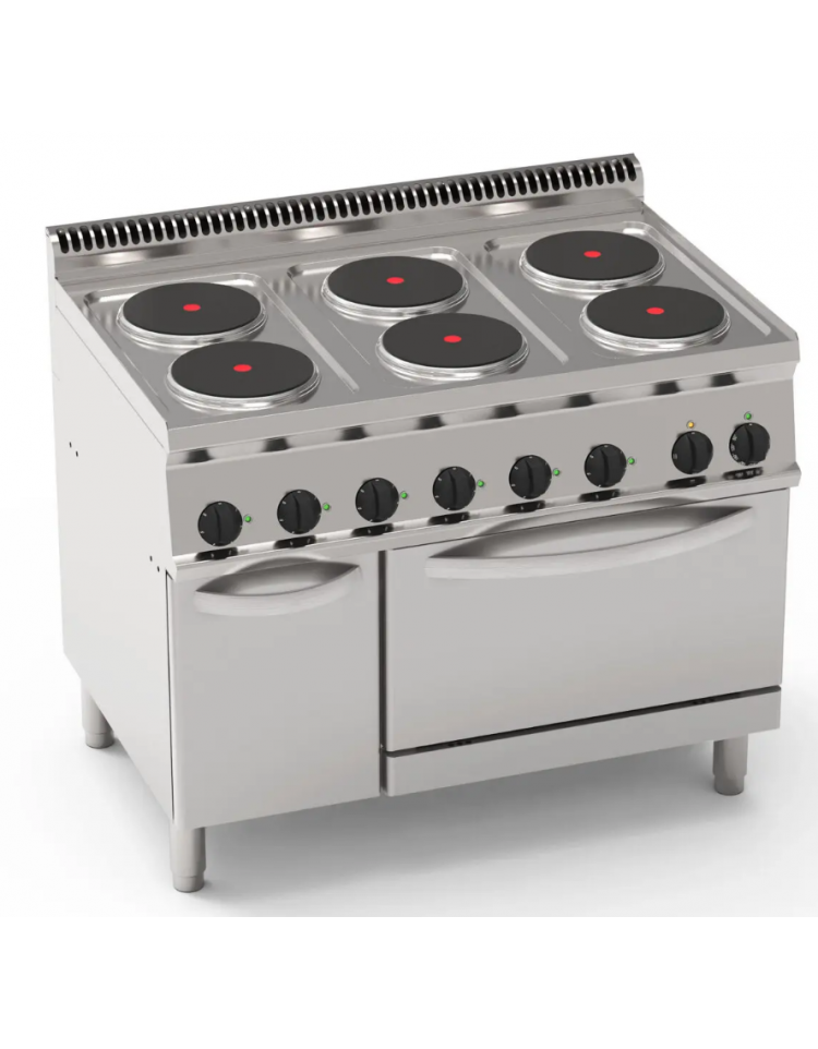 Piano di cottura in acciaio inox CrNi 18/10 AISI 304 trifase-15,6kw, 6 piastre tonde su mobile a giorno - cm 120x70,5x90h