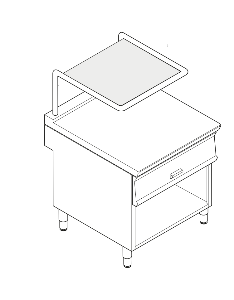 Piano di lavoro neutro freestanding su vano aperto da 80 cm con cassetto e supporto salamandra.