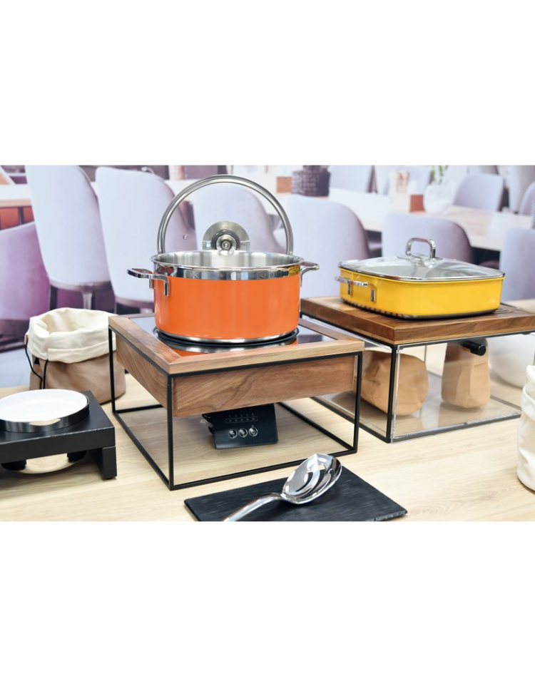 Piastra a induzione con regolatore di temperatura 60>140°C. Supporto in metallo nero, inserto in legno di noce e cornice inox.