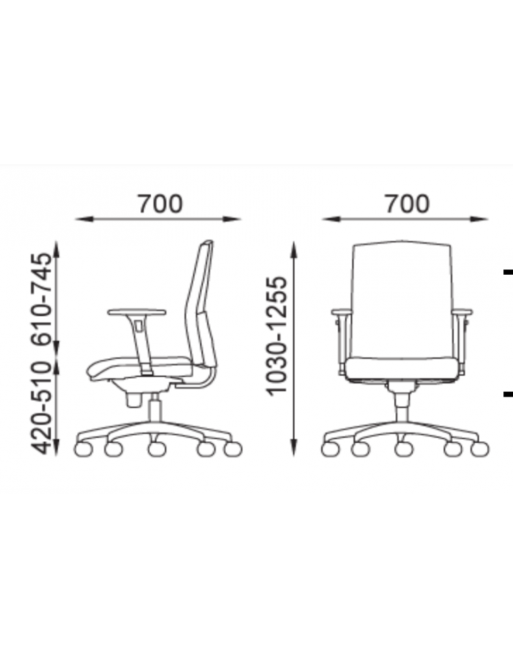 Leva per regolare l’altezza della seduta, leva per regolare l’inclinazione sedile e schienale sincronizzati, bloccabile in 5 posizioni + oscillante libero.