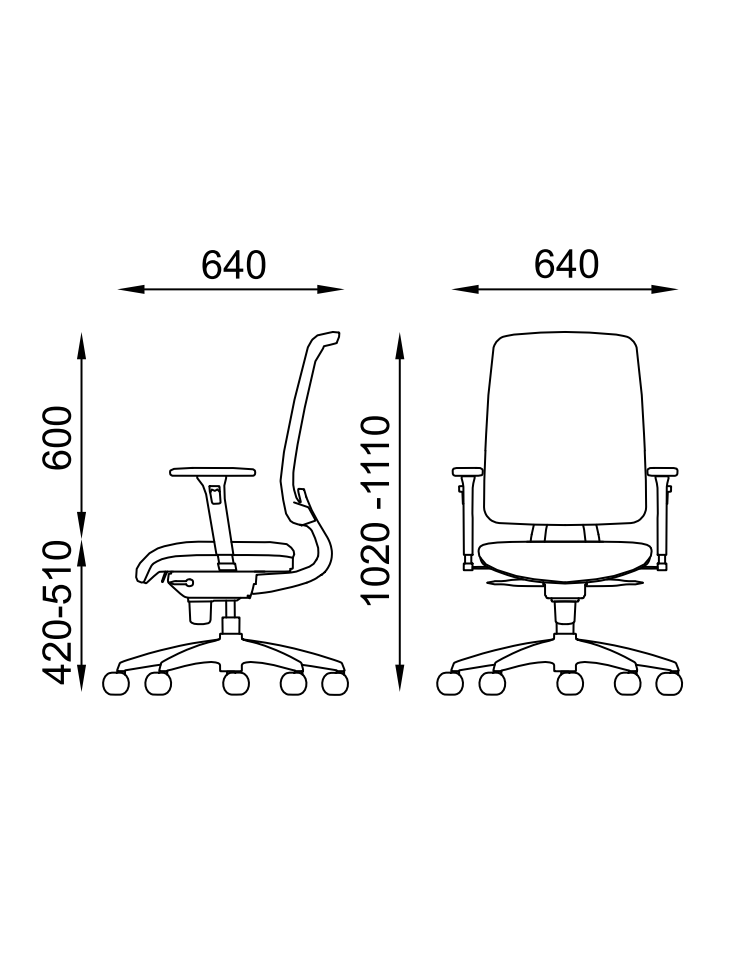 Leva per regolare l’altezza della seduta, leva per regolare l’inclinazione sedile (6°) e schienale (20°) sincronizzati, bloccabile in 5 posizioni + oscillante libero.