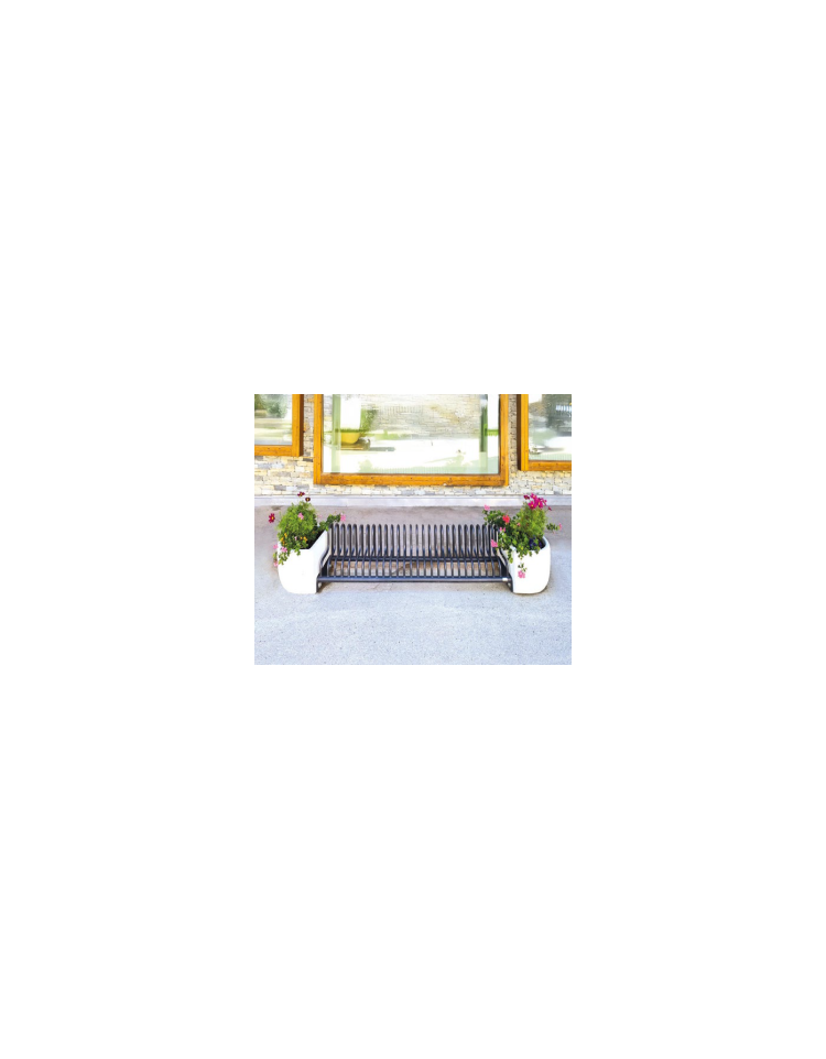 Portabici costituito da una rastrelliera di elementi in tubolare di acciaio, opportunamente sagomati e rigidamente saldati a due tubolari orizzontali tondi in acciaio. Lateralmente il portabici è sostenuto da due piastre in acciaio sagomate saldate ai tubolari che predisposte di fori permettono il fissaggio alle due fioriere in cemento che fungono da sostegni laterali. Tutte le parti metalliche sono zincate e verniciate a polveri poliestere termoindurenti. La viteria è in acciaio inox. Semplice ma funzionale.