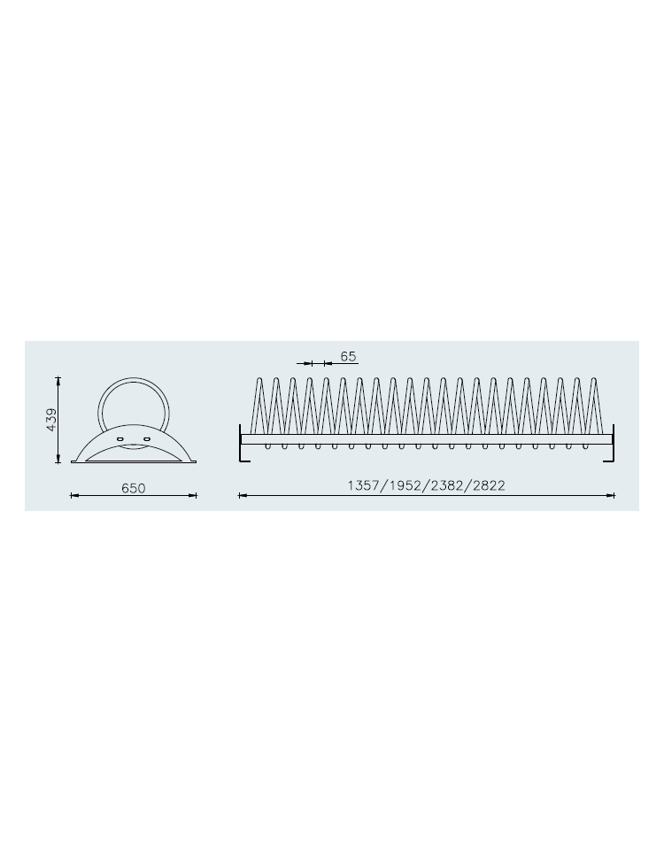 Il portabici è costituito da un elemento a spirale fatto saldato a due tubolari orizzontali tondi in acciaio inox. Alle estremità dei tubolari orizzontali sono saldate le staffe in piatto opportunamente forate per il fissaggio ai supporti laterali di sostegno tramite viti. I fianchi, ricavati da taglio laser e piegati a 90°, sono provvisti di fori per il tassellamento al suolo. Le parti metalliche sono in acciaio inox. Con accostamenti in serie può fare composizione a batteria. La viteria è in acciaio inox. Molto robusto è in grado di sopportare bene le intemperie, oltre ad avere un design moderno ed essenziale. Adatto a scuole, oratori, stazioni, ecc.