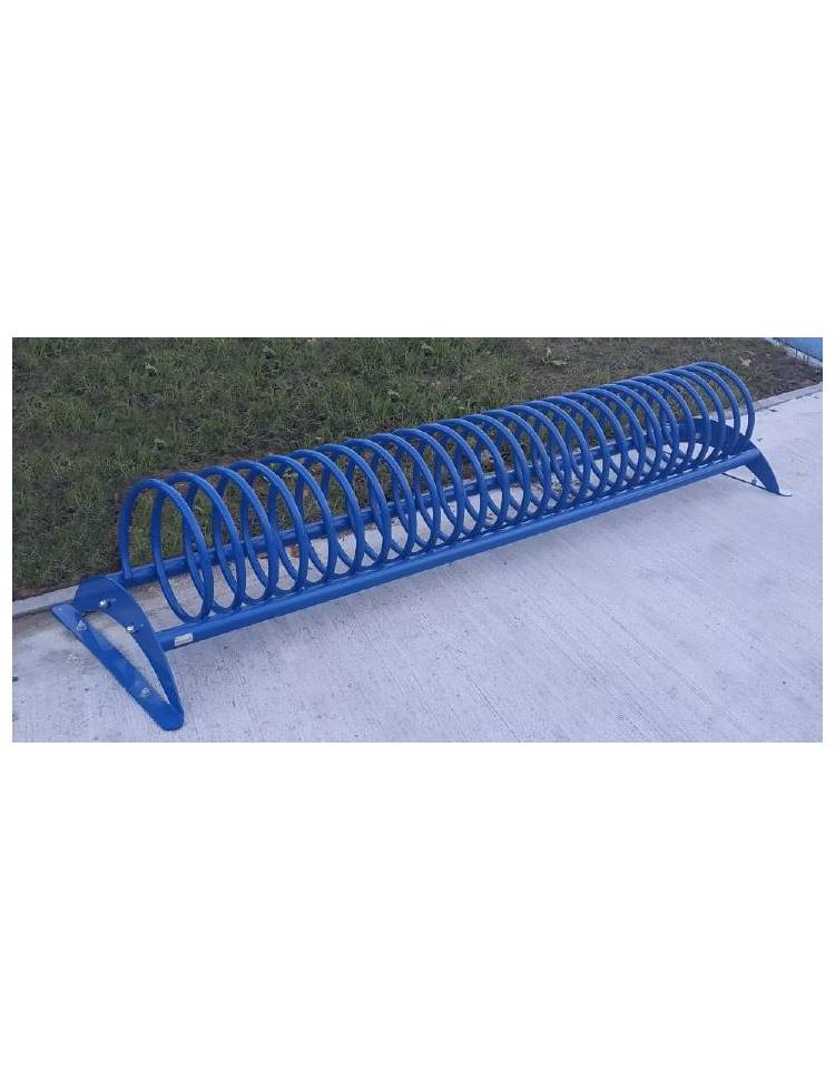Il portabici è costituito da un elemento a spirale fatto saldato a due tubolari orizzontali tondi in acciaio. Alle estremità dei tubolari orizzontali sono saldate le staffe in piatto opportunamente forate per il fissaggio ai supporti laterali di sostegno tramite viti. I fianchi, ricavati da taglio laser e piegati a 90°, sono provvisti di fori per il tassellamento al suolo. Le parti metalliche sono zincate e verniciate a polveri poliestere termoindurenti nelle diverse colorazioni RAL. Con accostamenti in serie può fare composizione a batteria. La viteria è in acciaio inox. Molto robusto è in grado di sopportare bene le intemperie, oltre ad avere un design moderno ed essenziale. Adatto a scuole, oratori, stazioni, ecc.