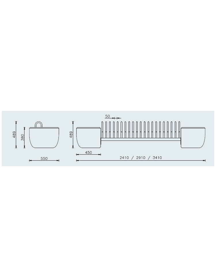 Portabici costituito da una rastrelliera di elementi in tubolare di acciaio, opportunamente sagomati e rigidamente saldati a due tubolari orizzontali tondi in acciaio. Lateralmente il portabici è sostenuto da due piastre in acciaio sagomate saldate ai tubolari che predisposte di fori permettono il fissaggio alle due fioriere in cemento che fungono da sostegni laterali. Tutte le parti metalliche sono zincate e verniciate a polveri poliestere termoindurenti. La viteria è in acciaio inox. Semplice ma funzionale.