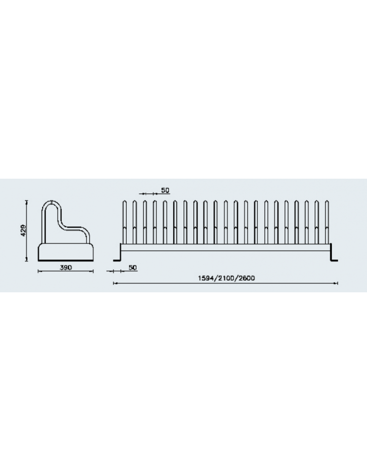 Portabici costituito da una rastrelliera di elementi in tubolare di acciaio opportunamente sagomati e rigidamente saldati a due tubolari orizzontali tondi in acciaio. Lateralmente il portabici è sostenuto da due piastre in acciaio sagomate saldate ai tubolari che predisposte di fori permettono il fissaggio al suolo tramite tasselli ad espansione. Tutte le parti metalliche sono zincate e verniciate a polveri poliestere termoindurenti nelle diverse colorazioni RAL. La viteria è in acciaio inox. Semplice ma funzionale.