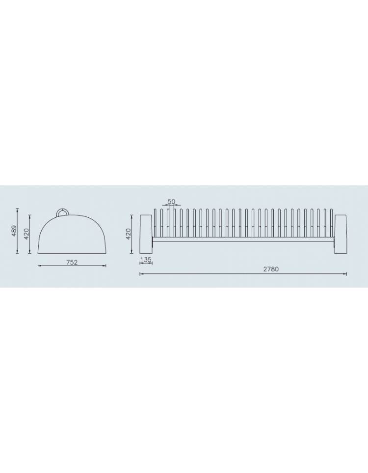 Portabici costituito da una rastrelliera di elementi in tubolare di acciaio opportunamente sagomati e rigidamente saldati a due tubolari orizzontali tondi in acciaio. Lateralmente il portabici è sostenuto da due piastre in cemento. Tutte le parti metalliche sono zincate e verniciate a polveri poliestere termoindurenti nelle diverse colorazioni RAL. La viteria è in acciaio inox. Semplice ma funzionale.
