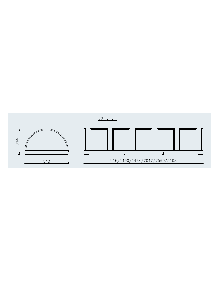 Il portabici è costituito da una rastrelliera composta da tondini del diametro di 12 mm, opportunamente sagomati e rigidamente saldati al telaio di base realizzato da profili a “L” 25x15 mm. Per maggiore rigidità tra un archetto e l’altro (saltando il posto bici) vengono saldati orizzontalmente dei tondini D. 12 mm nella parte superiore. Nella parte inferiore sono saldati dei profili a “L” che fungono da sostegni e da base. Può essere fornito nella versione da 4, 5, 6, 8, 10 e 12 posti o su richiesta. Tutte le parti metalliche sono zincate a caldo secondo normative UNI. Viene predisposto per il fissaggio a terra tramite tasselli D.8. Adatto a scuole o luoghi di grande flusso resistente alle intemperie ed agli atti vandalici. Su necessità si possono fissare anche in verticale al muro per diminuire lo spazio di ingombro.