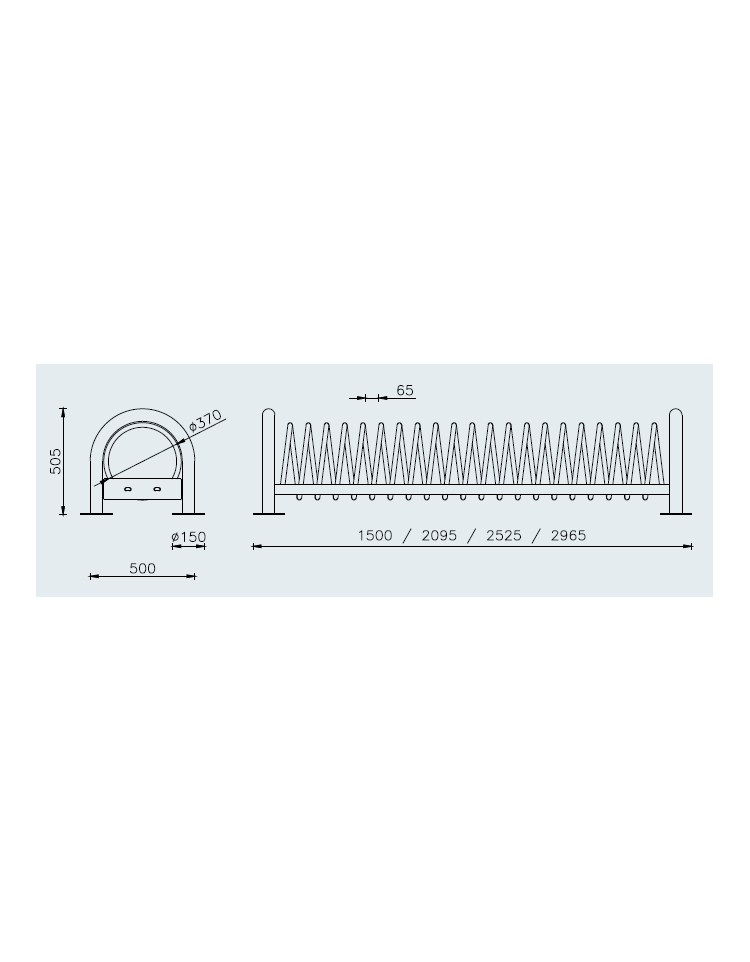 Portabici costituito da un elemento a spirale fatto con tubo saldato a due tubolari orizzontali tondi in acciaio. Alle estremità dei tubolari orizzontali sono saldate le staffe in piatto opportunamente forate per il fissaggio agli archetti laterali di sostegno tramite viti. I due archetti alle estremità sono in tubolare e alla base sono saldate 4 piastre per l’appoggio al suolo e predisposte di fori per il fissaggio a pavimento tramite tasselli ad espansione. Tutte le parti metalliche sono zincate e verniciate a polveri poliestere termoindurenti. Da 9 posti, con accostamenti in serie può fare composizione a batteria. La viteria è in acciaio inox. Adatto a scuole, oratori, stazioni, ecc. Molto robusto è in grado di sopportare bene le intemperie, pregevole, con un design moderno e con impatto gradevole sull’ambiente.