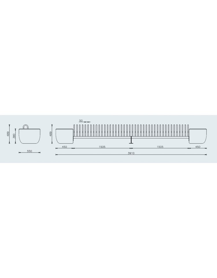 Portabici costituito da una rastrelliera di elementi in tubolare di acciaio, opportunamente sagomati e rigidamente saldati a due tubolari orizzontali tondi in acciaio. Lateralmente il portabici è sostenuto da due piastre in acciaio sagomate saldate ai tubolari che predisposte di fori permettono il fissaggio alle due fioriere in cemento che fungono da sostegni laterali. Tutte le parti metalliche sono zincate e verniciate a polveri poliestere termoindurenti. La viteria è in acciaio inox. Semplice ma funzionale.