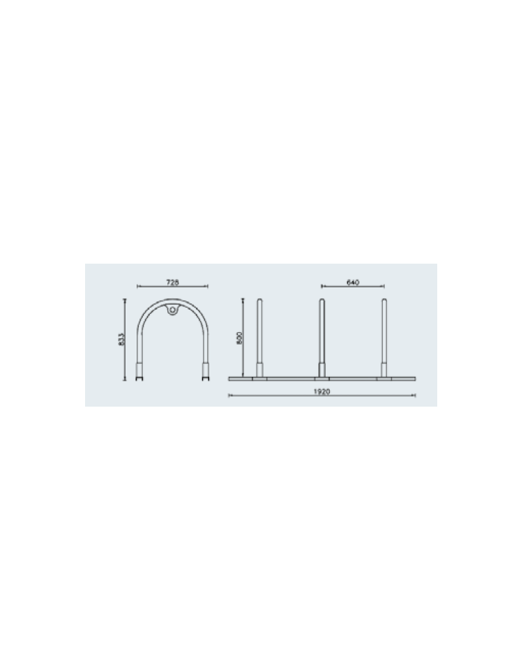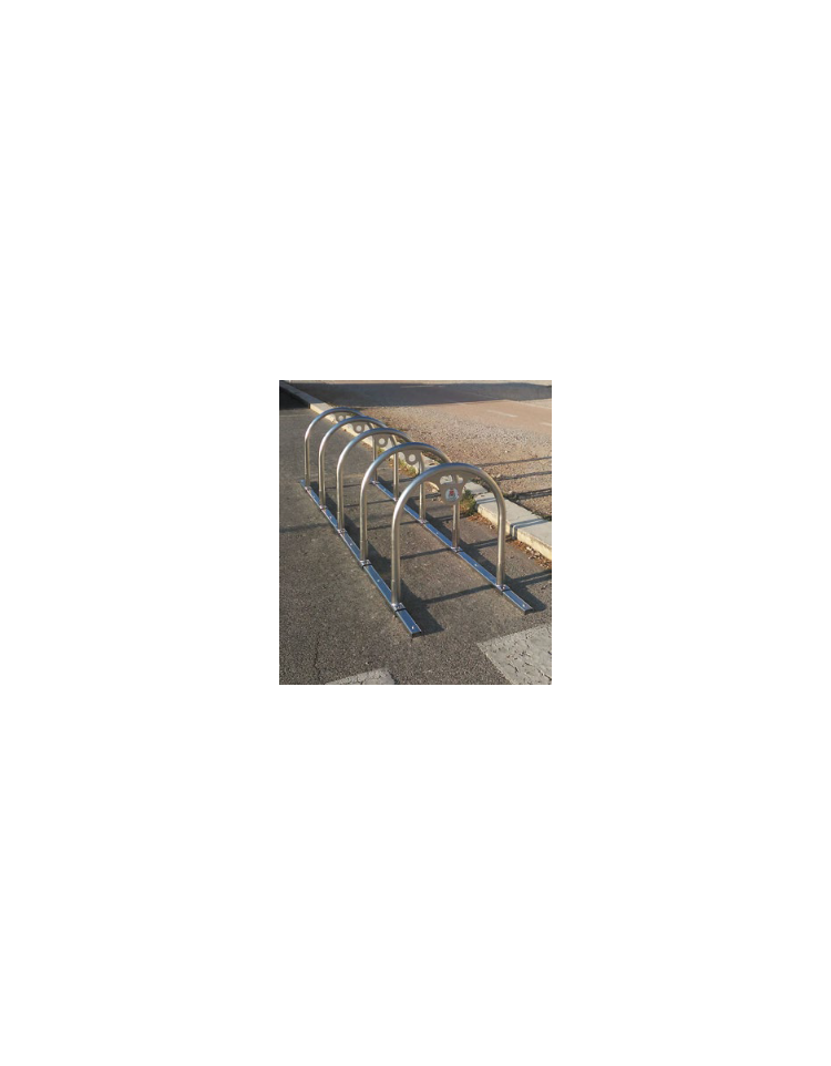 Portabici a 3 archetti realizzato in tubolare sagomato. Con piastre di base con tre fori per il fissaggio in sequenza in posizione dritta o inclinata L’elemento centrale è realizzato in lamiera sagomata con taglio laser con funzione di decoro e per poter assicurare la bicicletta sul telaio tramite catena con lucchetto. Tutte le parti metalliche sono in acciaio inox. Possibilità di fissaggio in sequenza in posizione diritta o inclinata (90° oppure 45°).