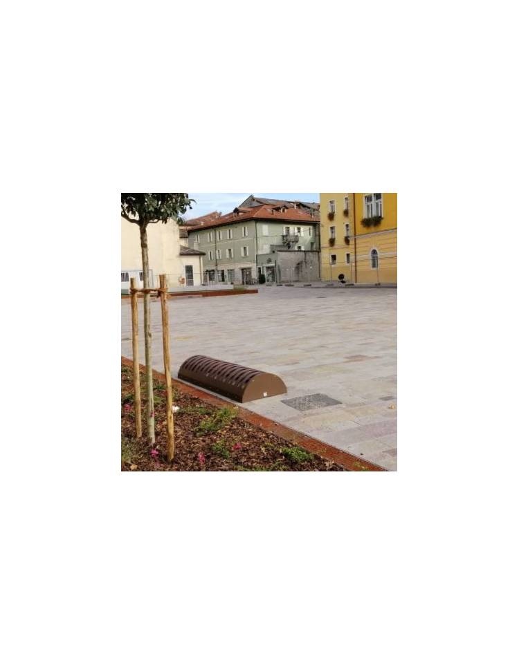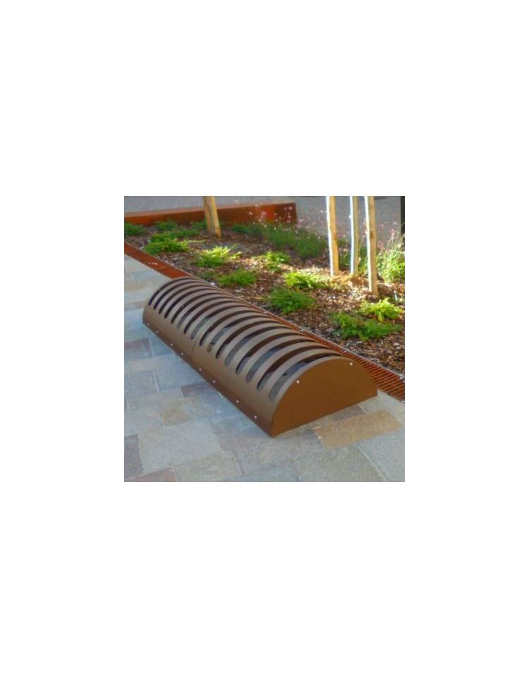 Portabici formato da elementi fissati tra di loro. Ogni elemento è costituito da una lamiera tagliata a laser con fori per l’alloggiamento delle bici, opportunamente calandrata, e dei rinforzi in lamiera con la predisposizione di fori per il fissaggio dei componenti fra loro. Gli elementi vengono poi fissati ad un profilo ad “L” forato in modo tale da permettere il tassellamento al suolo. Il portabici è interamente zincato e verniciato a polveri poliestere termoindurenti secondo le diverse colorazioni RAL. Tutta la viteria è in acciaio inox. Posizionato uno accanto all’altro questo portabici crea una composizione a batteria della lunghezza desiderata dal cliente.