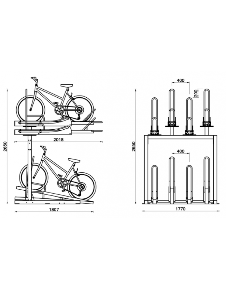 Portabici a 2 livelli, adatto alle zone ad alta densità popolare come stazioni, centri commerciali, scuole, parcheggi ed uffici.