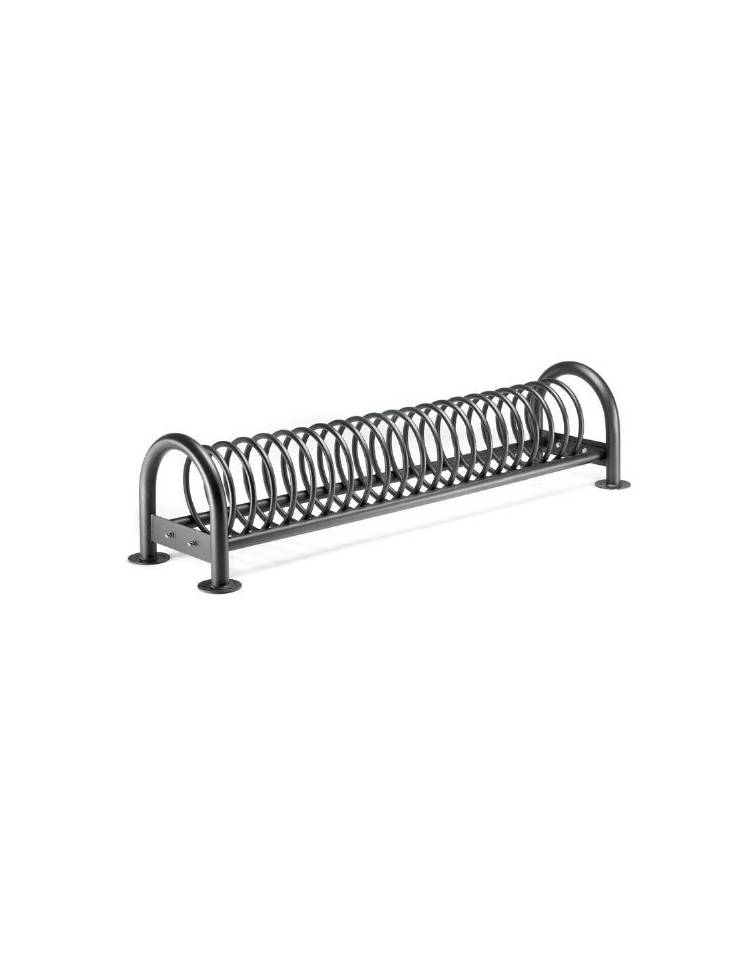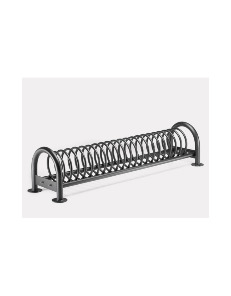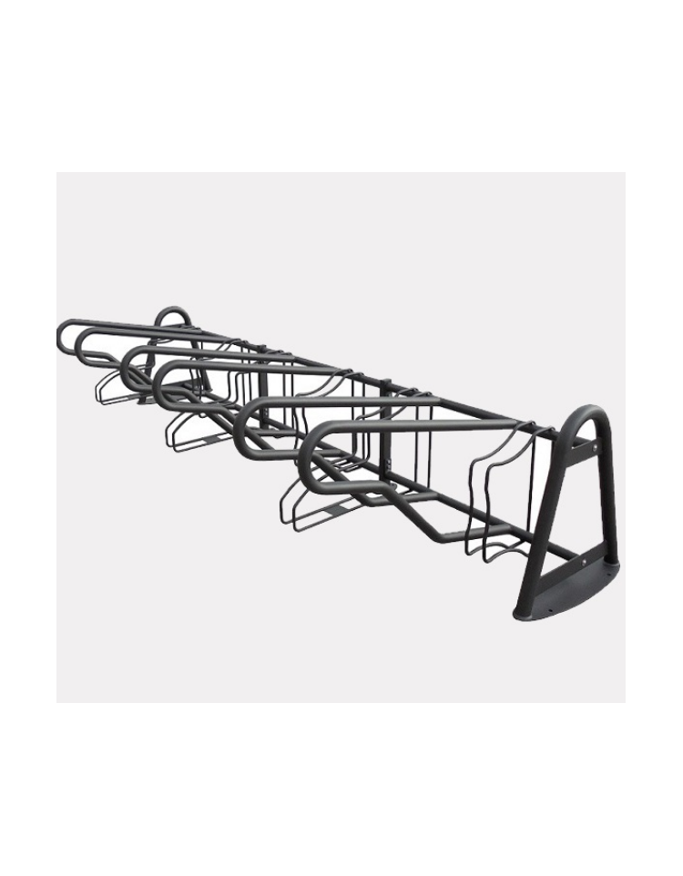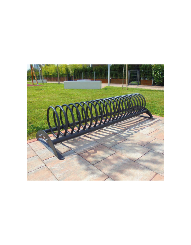 A cinque posti, interamente zincato a caldo. Realizzato con struttura portante in tubo di acciaio Ø 40 mm, elementi di parcheggio biciclette in tubo tondo di acciaio Ø 25 mm. Munito di piastre per ancoraggio nel terreno.