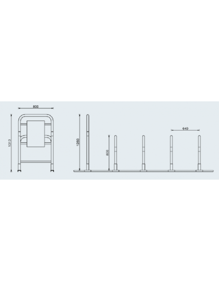 Portabici a batteria realizzato in tubolare fissato alla base ad un profilo a U. Viene prodotto a tre postazione ma essendo a batteria può formare lunghe aree di sosta. Interamente smontabile, facile da assemblare direttamente sul posto di posa, va tassellato al suolo. Ogni arco ha due fasce rifrangenti cl.1 per una migliore individuazione al buio. L’arco di inizio (e fine se a batteria) è di altezza superiore H.125 cm (rispetto agli altri H.85 cm) e a richiesta può essere applicata una targa 40×60 su cui viene realizzata la P di parcheggio e la figura della bicicletta. Zincato e verniciato nei colori RAL, tutte le viterie usate sono in acciaio inox. Forma e dimensioni possono cambiare a seconda delle esigenze, può essere collocato diritto o inclinato sino a 45° a seconda dello spazio utile, adatto a scuole o stazioni ove sicurezza e funzionalità siano elementi essenziali. Possibilità di fissaggio in sequenza in posizione diritta o