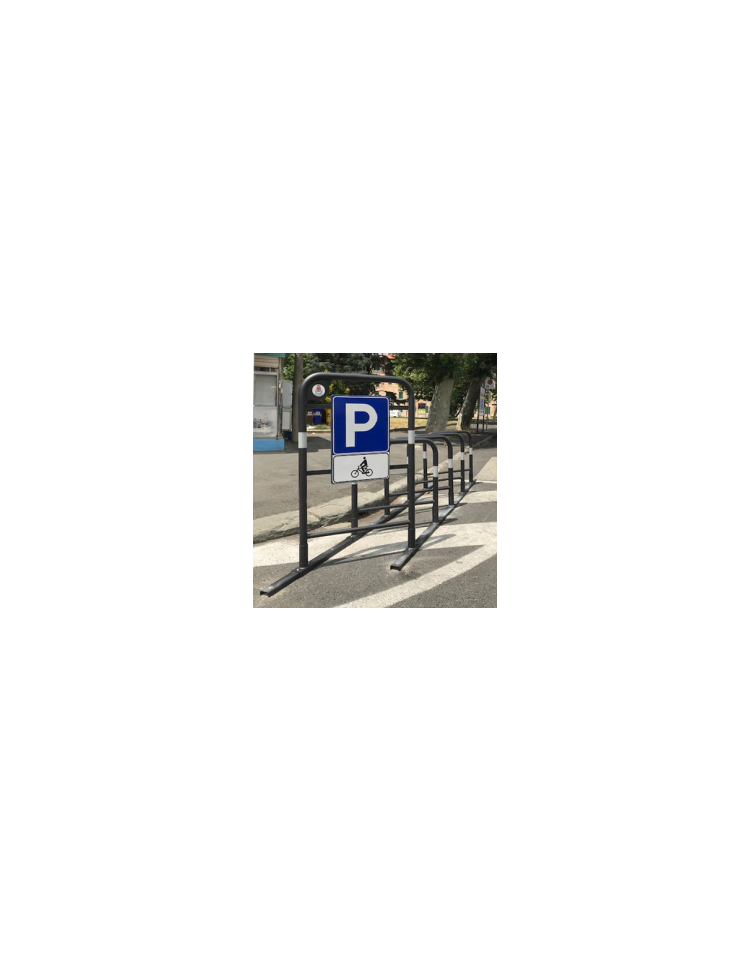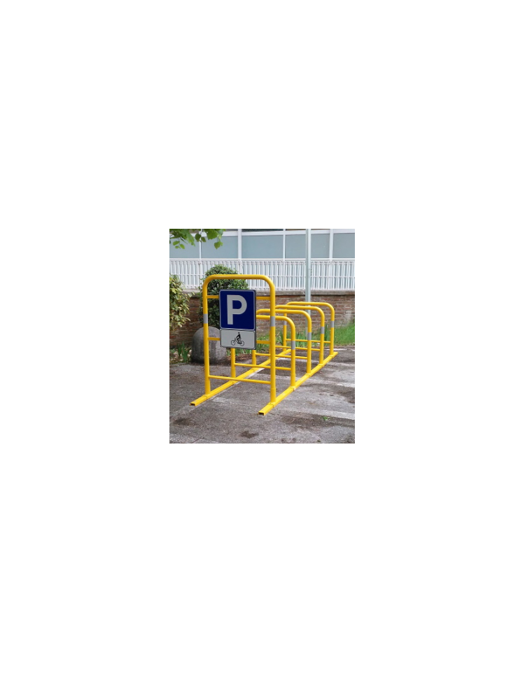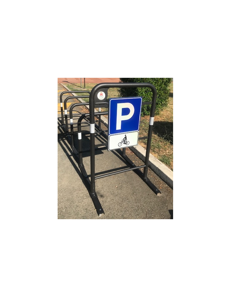 Portabici a batteria realizzato in tubolare fissato alla base ad un profilo a U. Viene prodotto a tre postazione ma essendo a batteria può formare lunghe aree di sosta. Interamente smontabile, facile da assemblare direttamente sul posto di posa, va tassellato al suolo. Ogni arco ha due fasce rifrangenti cl.1 per una migliore individuazione al buio. L’arco di inizio (e fine se a batteria) è di altezza superiore H.125 cm (rispetto agli altri H.85 cm) e a richiesta può essere applicata una targa 40×60 su cui viene realizzata la P di parcheggio e la figura della bicicletta. Zincato e verniciato nei colori RAL, tutte le viterie usate sono in acciaio inox. Forma e dimensioni possono cambiare a seconda delle esigenze, può essere collocato diritto o inclinato sino a 45° a seconda dello spazio utile, adatto a scuole o stazioni ove sicurezza e funzionalità siano elementi essenziali.
