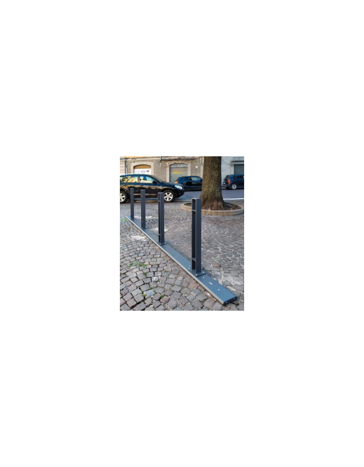 Portabici realizzato in piatto. Il fissaggio al suolo è previsto con piastra base con fori per il fissaggio tramite tasselli ad espansione. Il portabici è in acciaio zincato e verniciato a polveri poliestere termoindurenti nelle diverse colorazioni RAL.