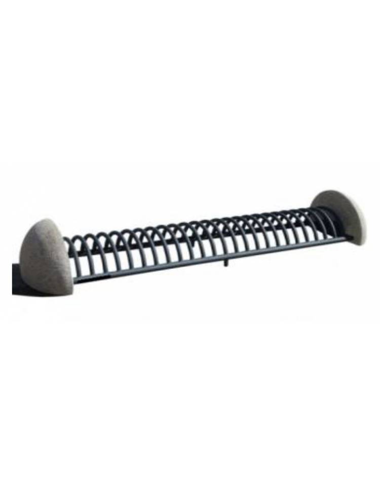 Portabici, realizzato in acciaio zincato e verniciato a polveri termoindurenti, sostenuto da due basamenti in cemento bianco del tipo 52,5 R ad alta resistenza, vibrati ad alta frequenza per megliorare la compattazione dell'impasto