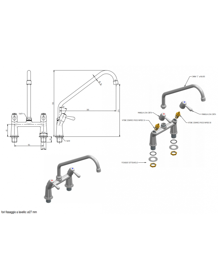 RUBINETTO BIFORO CON CANNA GIREVOLE ”C”,Ø18x300, MANIGLIA A LEVA. INTERASSE 155mm-LUNGHEZZA CANNA MM 300